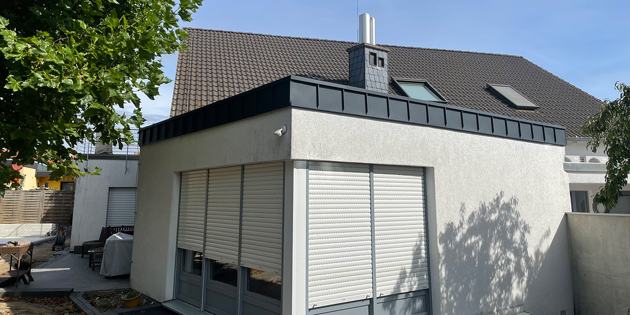 Moderne Flachdachsanierung mit langlebiger Abdichtung, Gefälledämmung und hochwertiger Stehfalz-Metallbedachung.